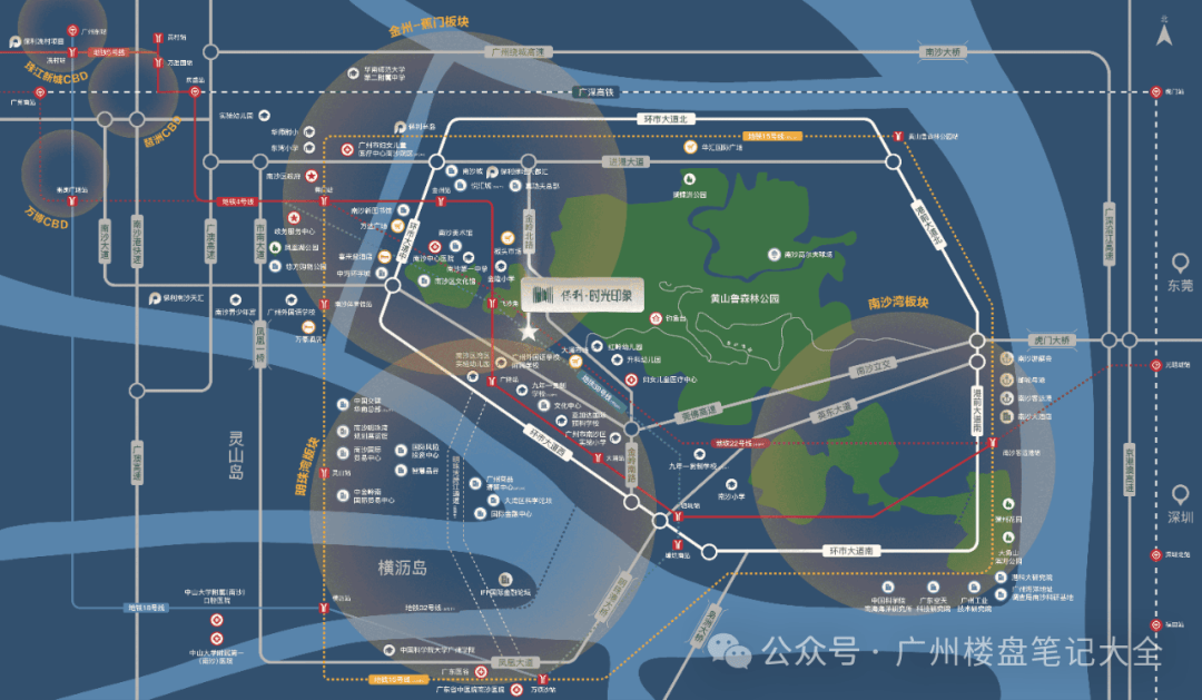 我们(保利发展控股)特别强调物业服务体系的重要性。保利物业在全国物业企业综合实力排名中长期位列前列,服务经验超过26年。物业管理不仅涉及基础保安保洁,更涉及智慧社区系统建设、应急响应机制、公共空间运营以及社区文化服务。小蛮腰、人民大会堂等国家级公共建筑曾采用相同服务体系,这种物业品牌背书在高端住宅市场具有明显价值溢价效应。社区归属感和安全感往往直接影响二手市场流动性与资产保值能力。项目区位交通网络是核心竞争优势之一。距离飞沙角与广隆双地铁站直线米,属于典型的步行生活圈覆盖范围。地铁交通在一线城市房地产价值体系中属于硬通货资产。项目可通过地铁换乘体系,一站抵达金州商圈,两站进入蕉门核心行政商业区,并可进一步接驳22号线实现与庆盛高铁枢纽的连接。未来区域规划中,4号线号线号线形成多线交汇格局,将显著提升通勤效率。50分钟左右即可进入琶洲金融城工作圈,这种时间成本控制对于都市精英人群具有极高吸引力。