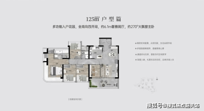 :西南朝向,使用率100%。约5.7米面宽的瞰山阳台,将山景引入室内,主卧270°弧形玻璃幕窗,视野开阔。